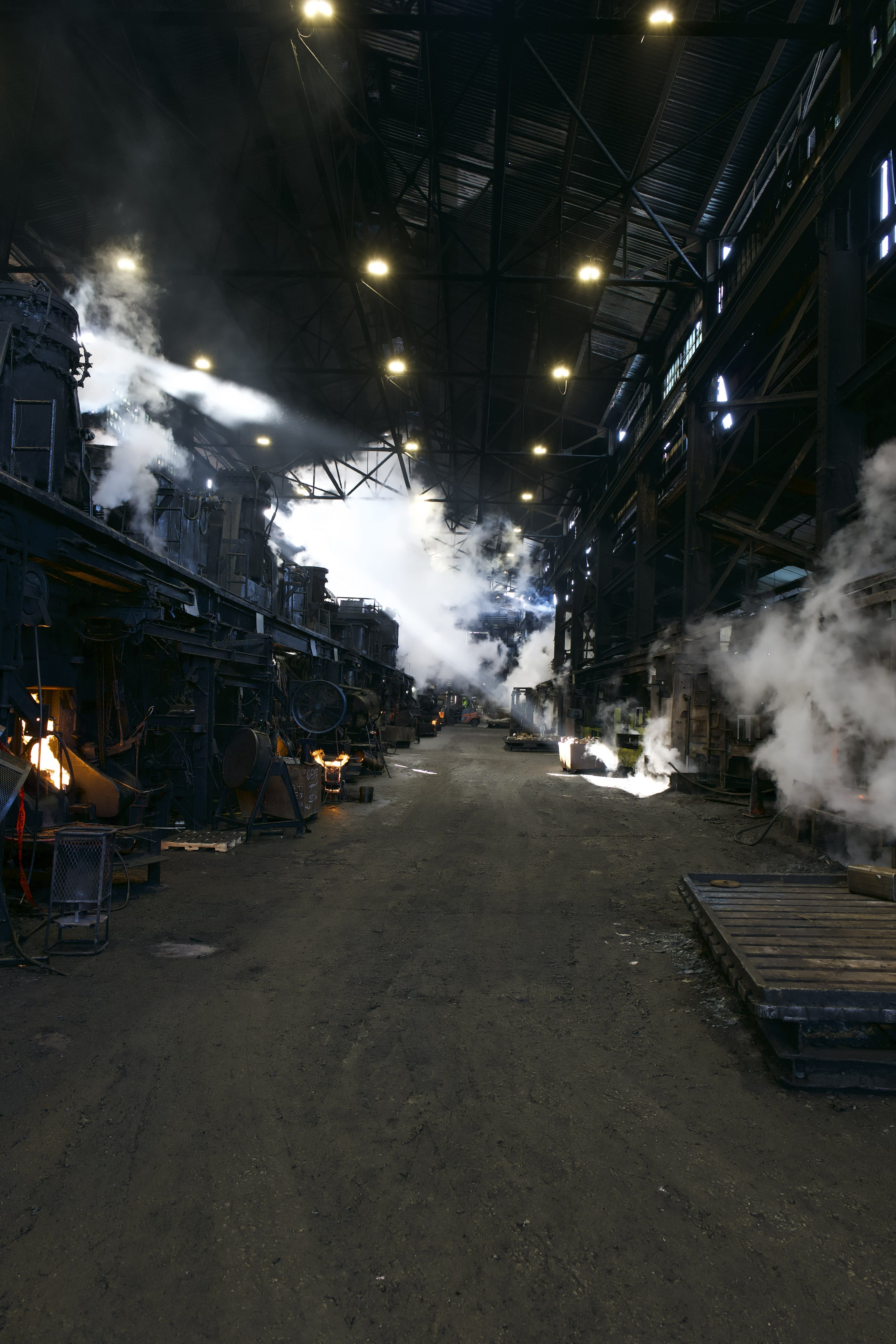 Step inside the space and the conditions become immediately clear. The forge stretches roughly 300 feet long, 60 feet wide, and 60 feet tall. Originally built with large windows, the facility once allowed natural light to flood the interior—enough, as one observer noted, “to grow palm trees.” Today, those windows are completely obscured by soot, allowing almost no daylight through.